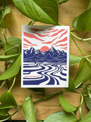 Inspired by the view of Kachemak Bay in Homer, AK. Cards are printed locally in Anchorage and come with a Kraft envelope made with 100% recycled materials. Each card started out as an original linocut print inspired by the places artist Kristin Vantrease loves around AK: