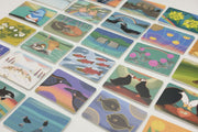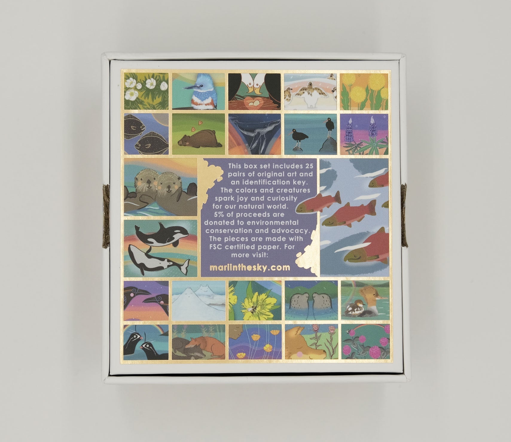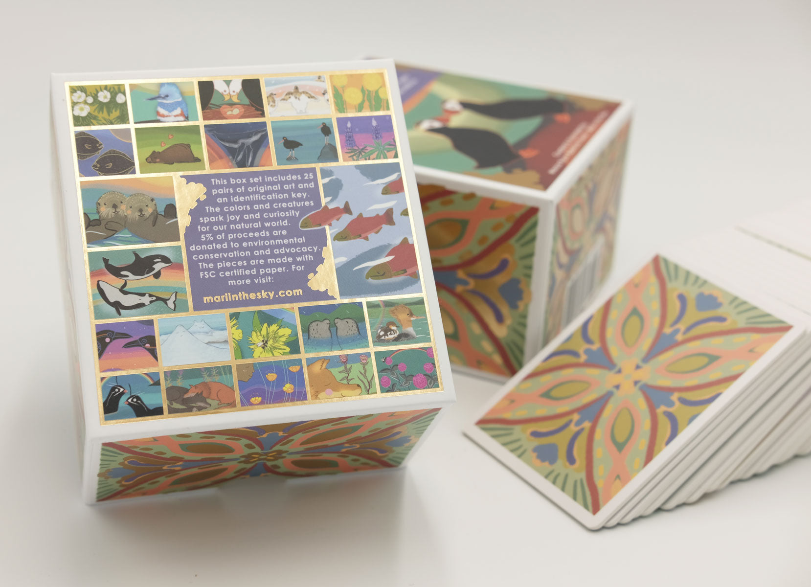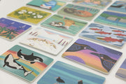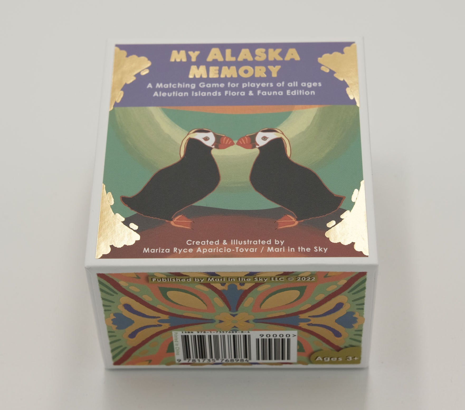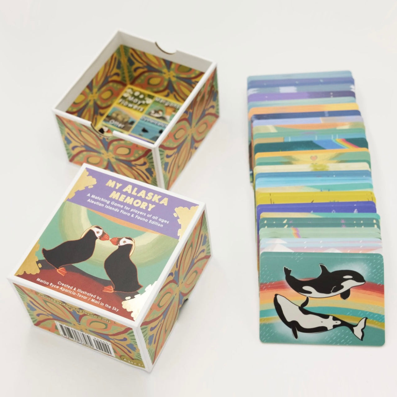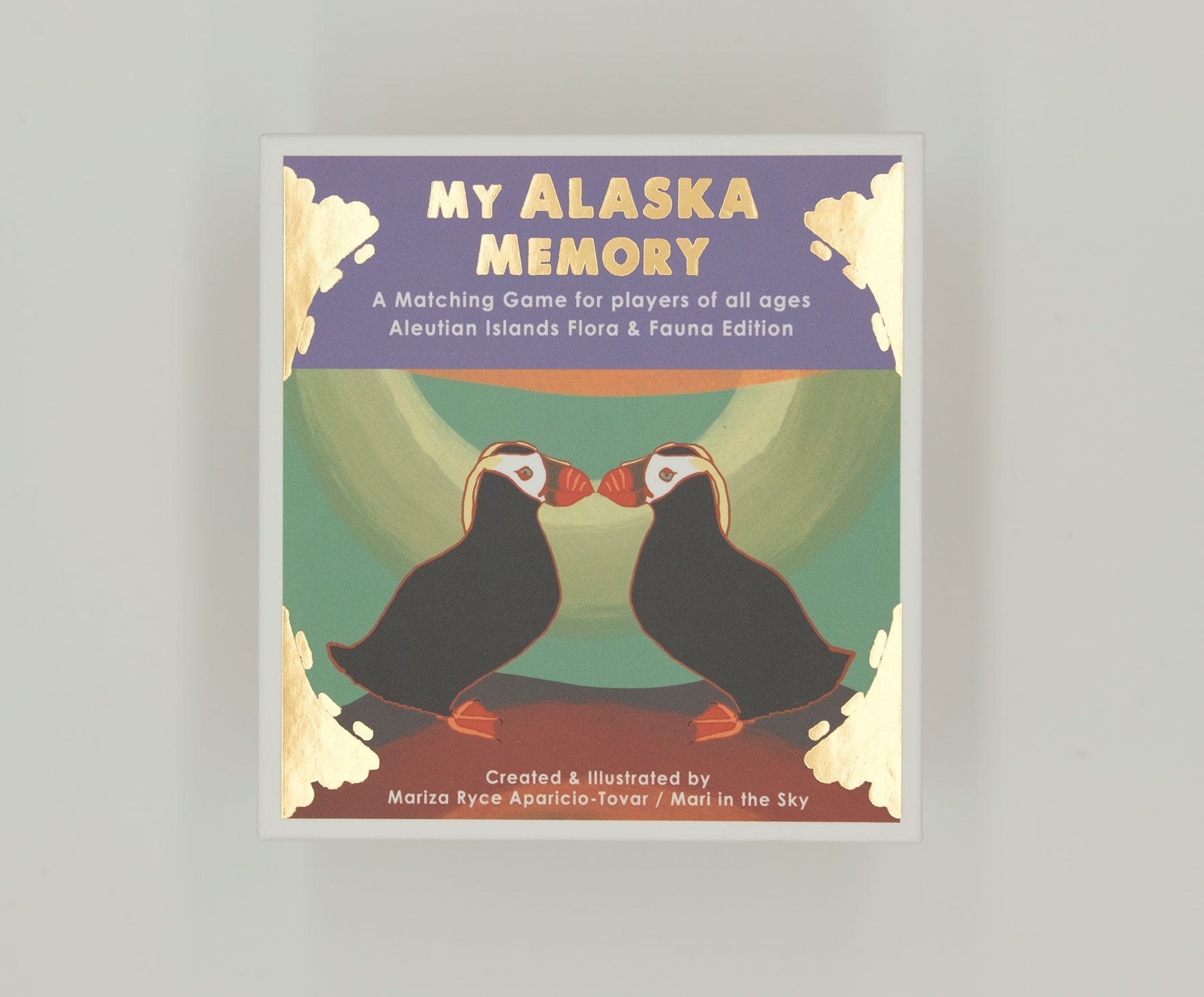 A collection of 25 original art pieces depicting Aleutian Island flora and fauna (total of 50 pieces/25 pairs). This game is suitable for players 3 and up. Enjoy the colors and lively energy of Alaska with this game for the child in all of us. The game comes in a two part box and features thoughtful gold stamping on the box.