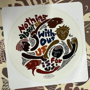 This sticker features Ricardo Levins Morales' illustration of the powerful slogan "Nothing About Us, Without Us, is For Us", which originated in the South African disability rights movement. It could be the basic operating principle of people's movements around the world.