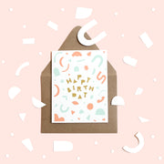 A festive and colorful birthday card that feels exciting to celebrate with. This birthday card is perfect for kids or friends of any age, full of festive geometic shapes, metallic ink and happy colors. Worthwhile Paper screen prints their greeting cards sustainably and locally!