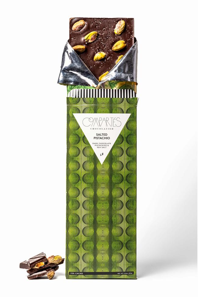 Compartés's Salted Pistachio dark chocolate bar blends roasted jumbo pistachios into our signature dark chocolate, and is finished with a sprinkling with sea salt. Inspired by Compartés's popular salted pistachio truffles. Wrapped in an eye-catching, designer package featuring a graphic pattern in shades of green. Handmade in our Los Angeles Kitchen.