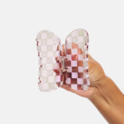 This medium-sized hair claw is super versatile and works for all hair types and textures. Our checker patterned material is created by hand and slight variations in pattern will occur. Made from high-quality acetate; a durable, plant-based bio-plastic. Metal hardware is lead and nickel-free. Measures approx 3.5"L x 1.75"H x 1.5"D