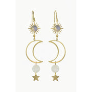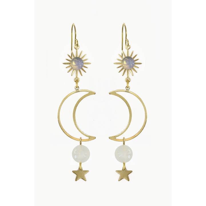 Moonstone beads and opalite cabochons adorn brass celestial shapes dangle from brass ear wires, 2.8 inches, nickel free.