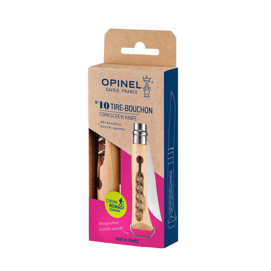 The No.10 Corkscrew Knife - now with a bottle opener attachment - is the perfect picnic knife! The beech wood handle houses a 5-turn steel corkscrew, sturdy enough for even the most stubborn of corks, and a patented bottle opener attachment on the end of the handle allows you to easily pop the top of your favorite bottled beverage.