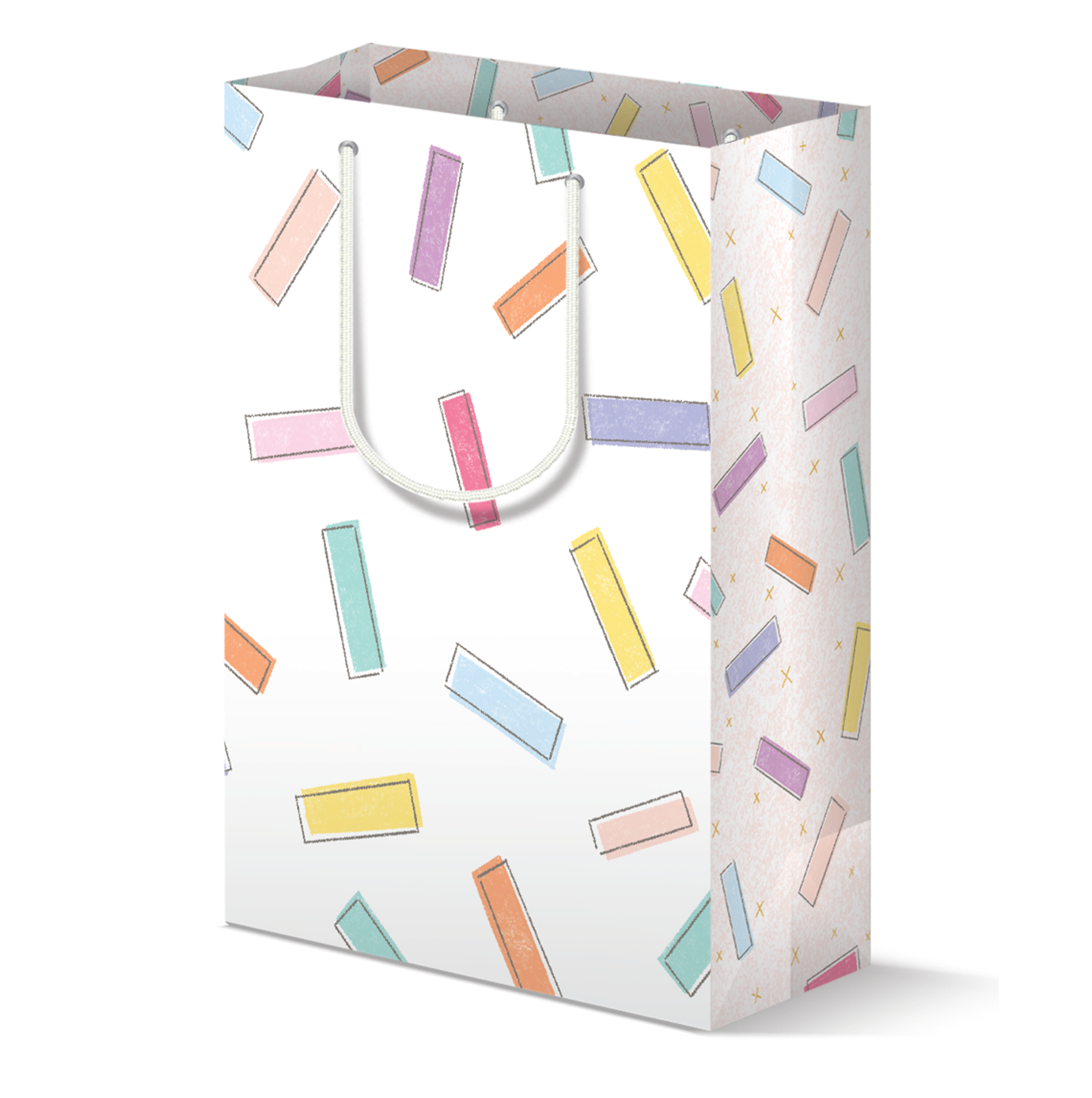 • Luxury gift bag printed with hand-drawn block confetti in pastel colors.
