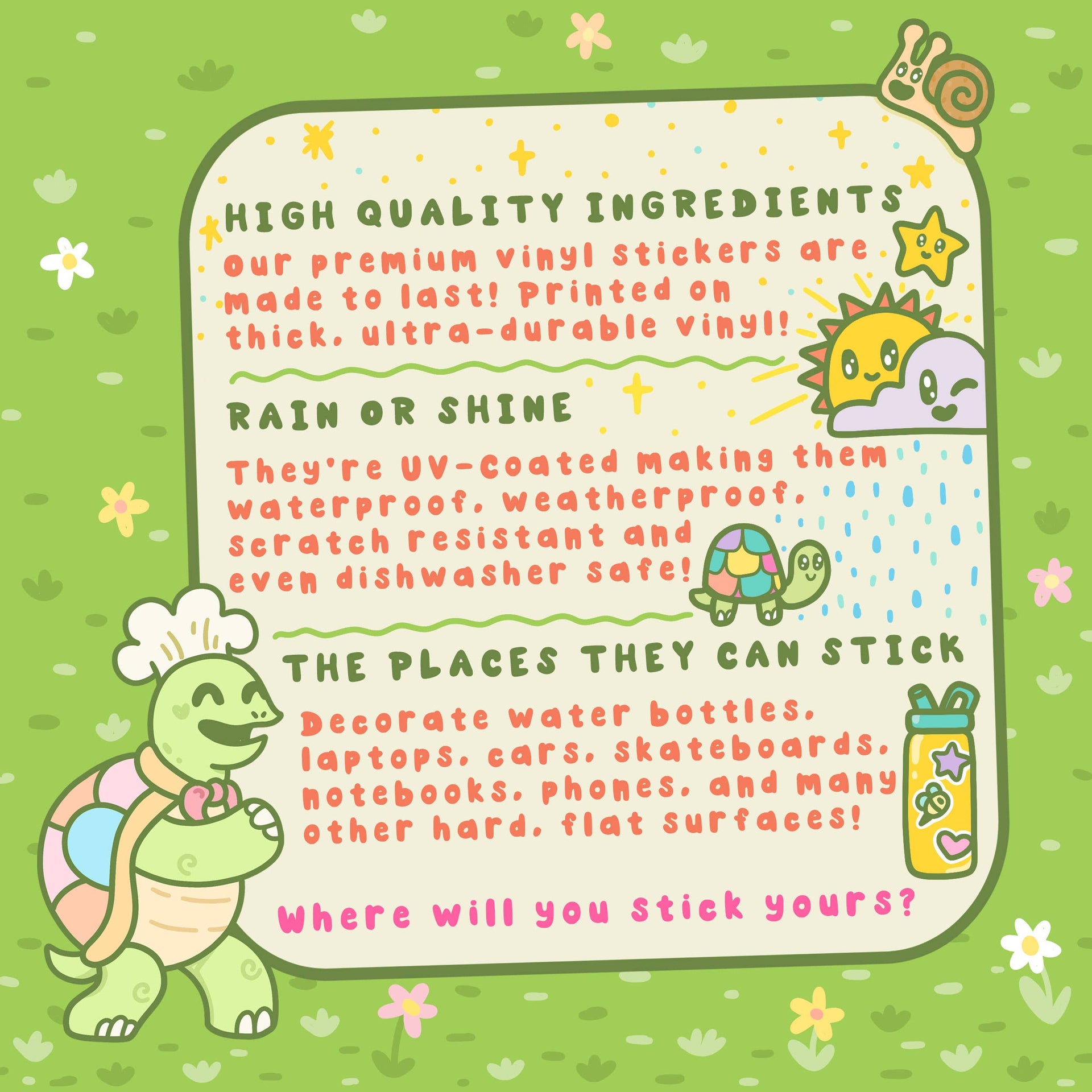🐢 Turtle's Soup's Turtley Awesome vinyl stickers are made from the highest-quality ingredients on the market! Printed on thick, ultra-durable vinyl, these stickers are made to last. They're UV-coated, making them waterproof, weatherproof, and dishwasher safe!