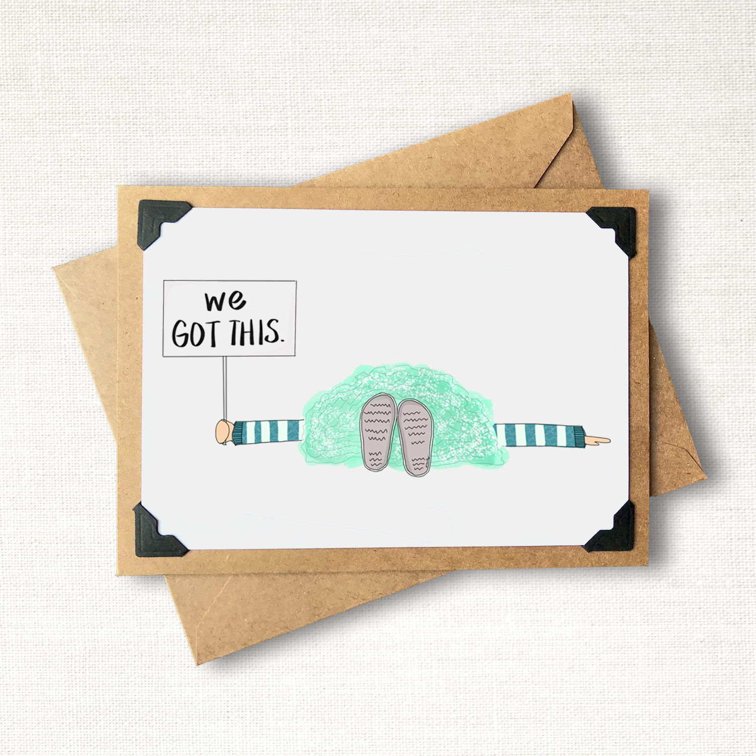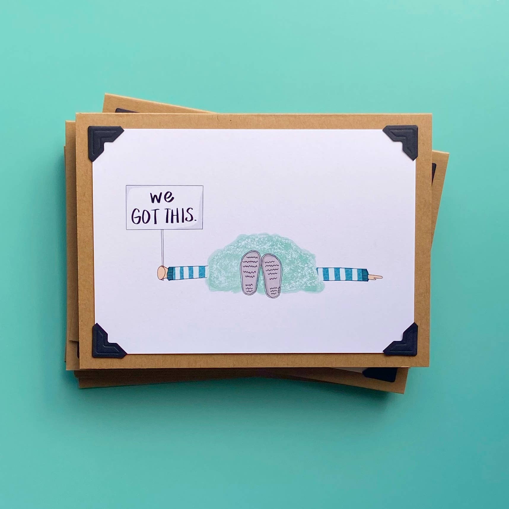 We've so got this. We really do. Product details: This is a 4.25" x 5.5" A2 100# 17pt kraft note card. The removable art print is 3.75" x 5" and printed on uncoated 100# 14pt smooth cardstock. This card is blank inside. This card reads: We got this. This is a mini print card, which means the 3.75" x 5" print pops out of the attached corners. Mini prints are laser printed on 100lb matte card stock. Each card comes with a kraft envelope in a sealed cellophane sleeve for protection. Every card is assembled, stamped and packaged by hand with love. Due to the small batch, handmade nature of the product, it may show slight differences in color.