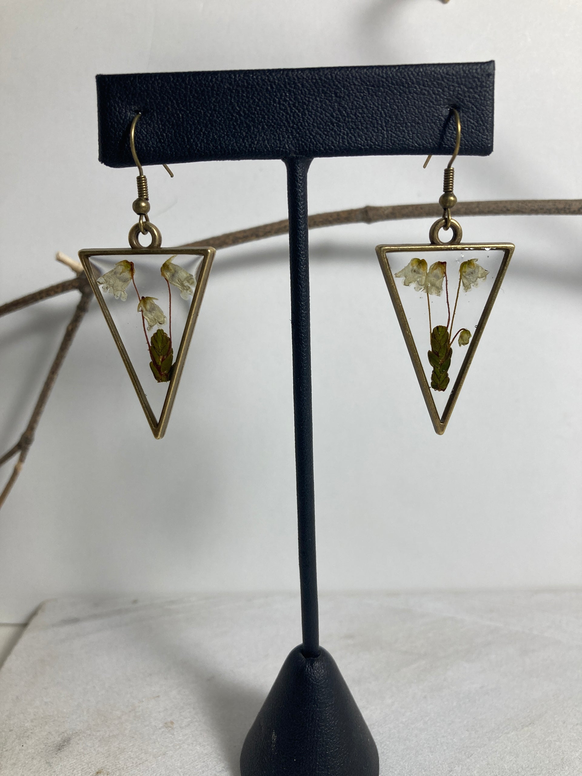 pressed flowers, resin, .925 sterling silver-plated and gold-plated hooks, hypoallergenic bronze